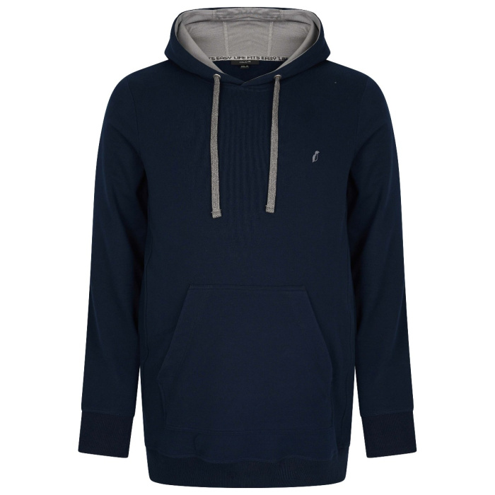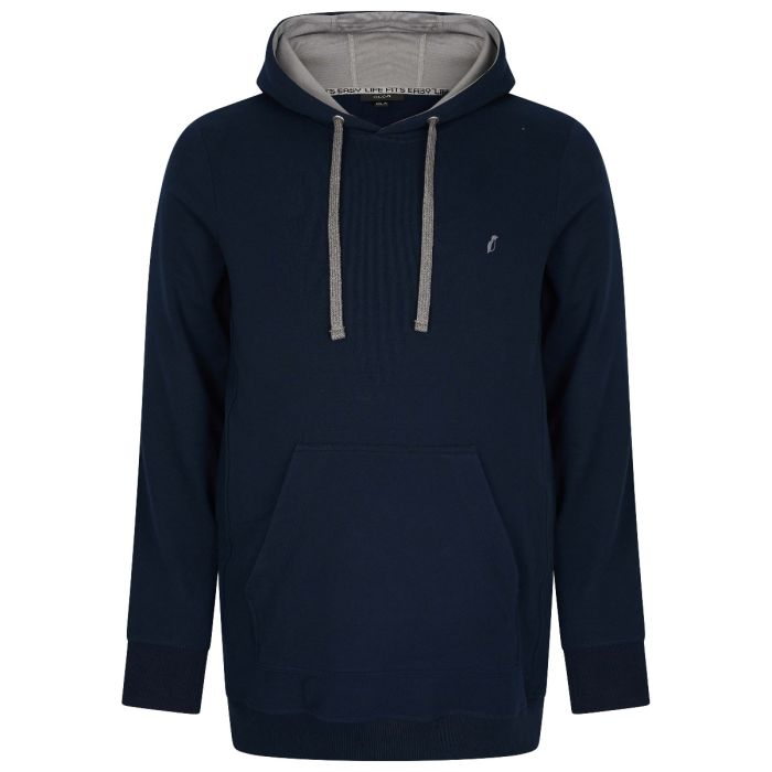 Deze navy hoodie is speciaal gemaakt voor mannen met een grotere bouw (maat 2XL t/m 8XL). De stof is van katoen met stretch, dus hij zit soepel en geeft genoeg ruimte. Hij heeft een capuchon en buidelzak – ideaal voor thuis, onderweg of op de bank.